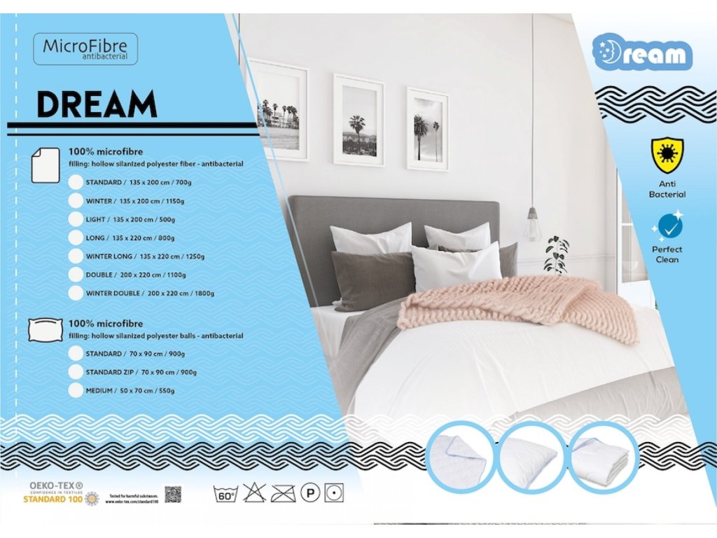 Paplón DREAM sa vyznačuje veľmi príjemným vrchným materiálom – MICROFÁZOU, ktorá je na dotyk jemná, mäkká a komfortná. Vďaka špeciálnemu plneniu s prevzdušnenými, priestorovo vrstvenými vláknami s technológiou dutého jadra, je tento paplón schopný rýchlejšie odvádzať nadmerné teplo od pokožky a minimalizovať tepelné úniky.