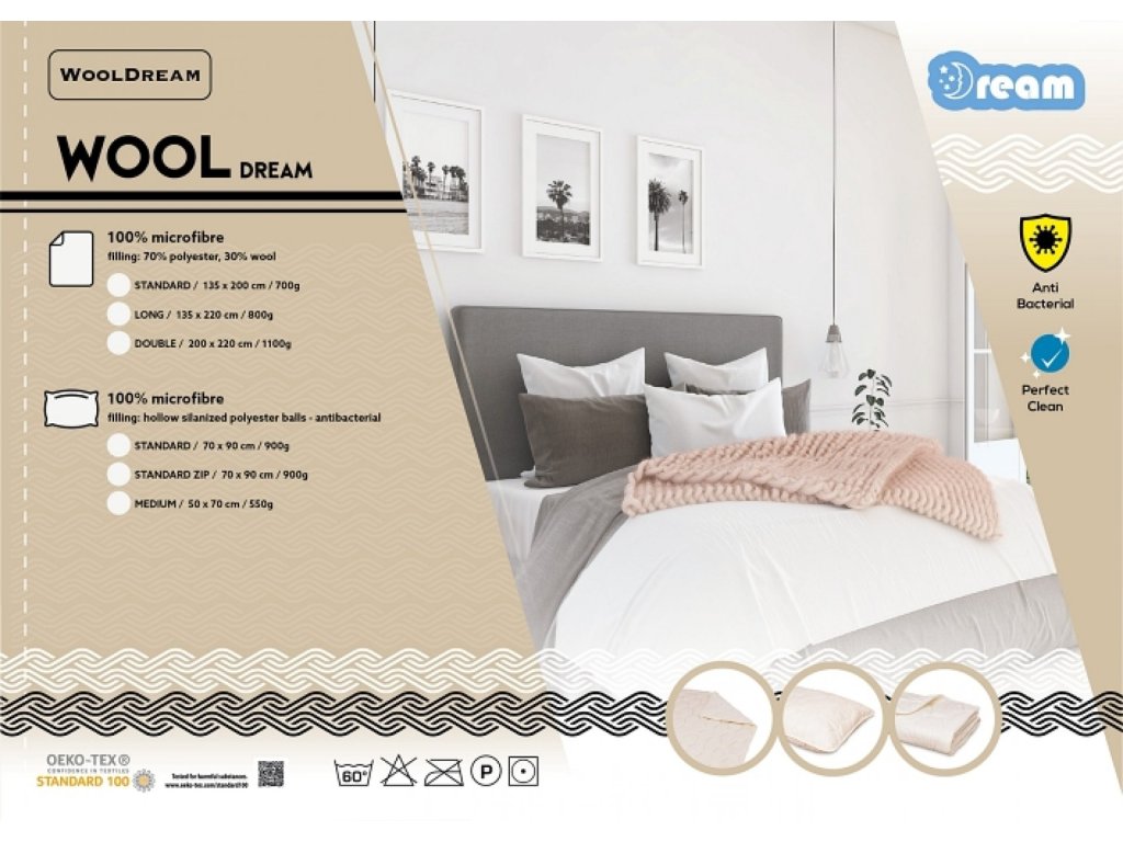 Paplón línie WoolDream sa vyznačujú veľmi príjemným vrchným materiálom – MICROFÁZOU krémovej farby, ktorá je na dotyk jemná, mäkká a komfortná, so špeciálnou výplňou kombinácie značkovej prírodnej ovčej vlny WoolDREAM a dutého silanizovaného vlákna, zabezpečujú vynikajúci tepelný komfort so zárukou zdravého, ničím nerušeného spánku.